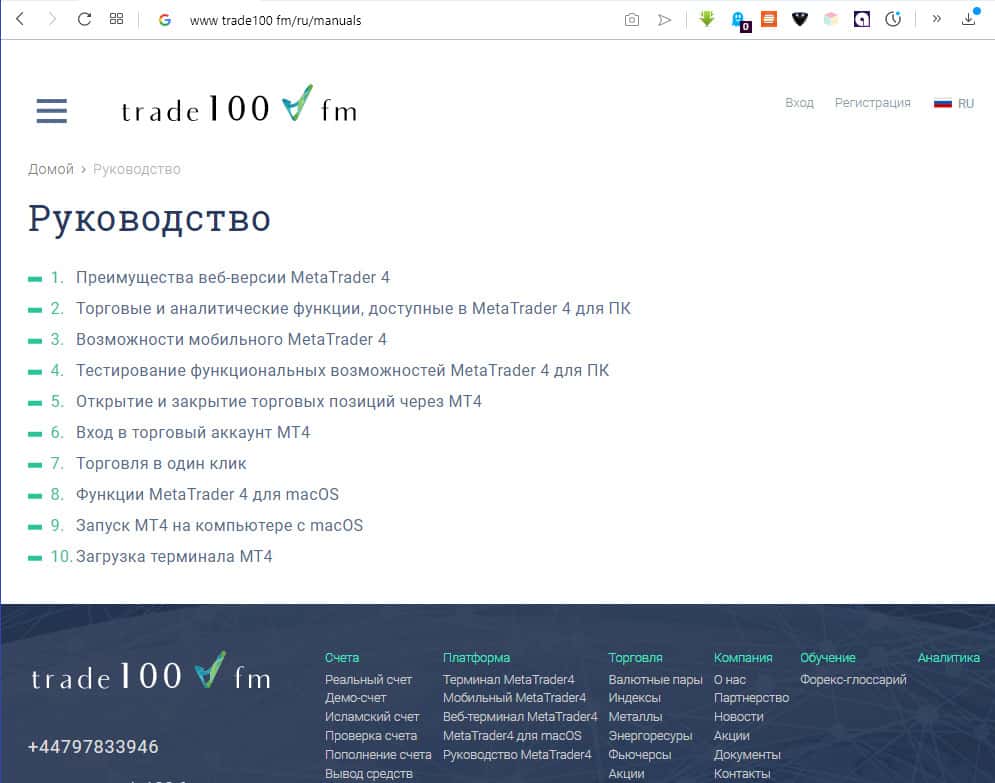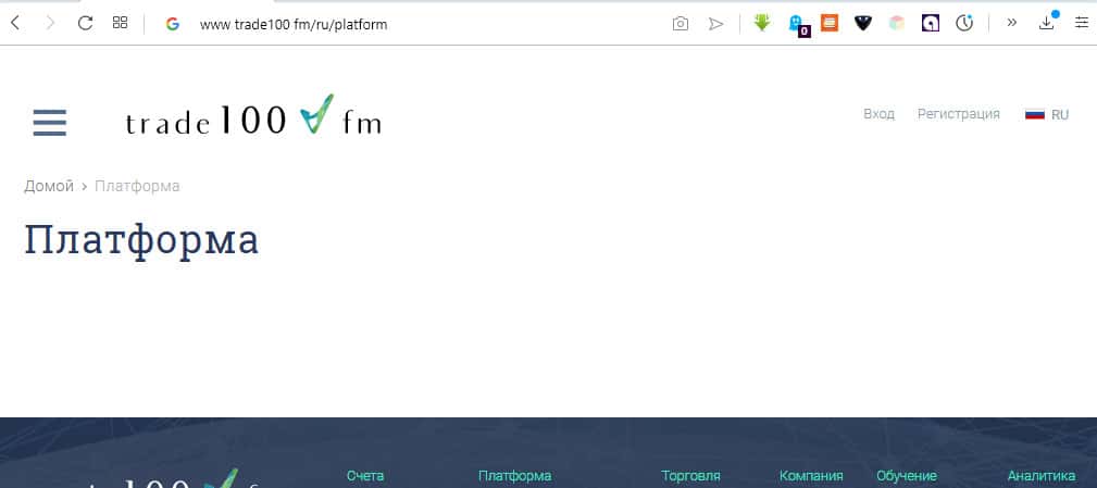 Поражает своей краткостью (талантом аферистов Трейд100 фм) страница, описывающая торговую платформу брокера. Но как оказалось, это общая практика сайта и все разделы имеют пустую страницу с названием раздела. Видимо техническая поддержка сайта посчитала достаточным, расположенное внизу страницы меню, тогда убрали бы ссылки на разделы, что ли?