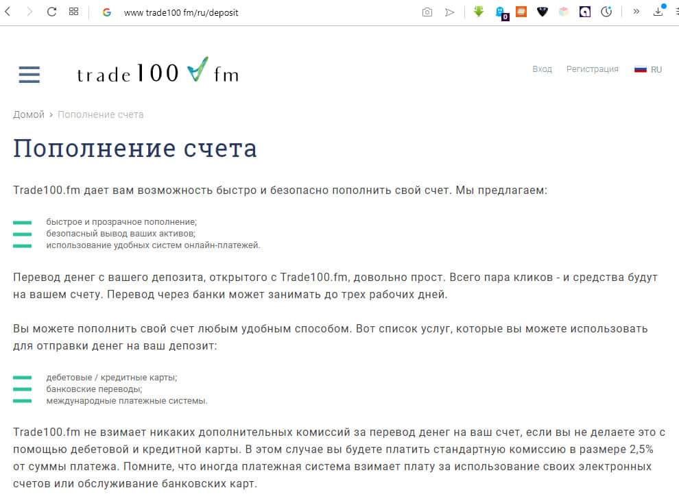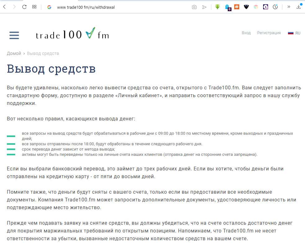 Проблемный вывод денежных средств с депозита на Трейд100 фмТорговая платформа для лжеброкера Trade100 fm