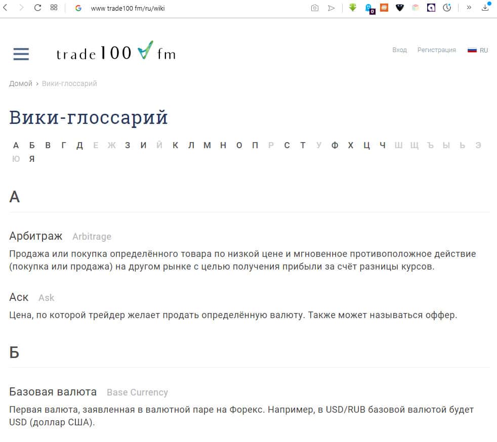 Пример раздела торговля на портале Трейд100 фм Другие брокеры эту информацию обычно помещают в раздел обучения. На рассматриваемом сайте раздел обучение существует, но в него непосредственно вошел только справочник терминов финансового рынка, а где же обещанное обучение и сопровождение клиентов? Всё, и ни о чём - полная белиберда!