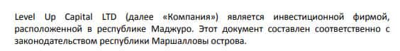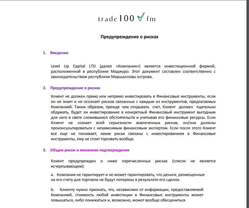 Неудачная попытка связаться с технической поддержкой Трейд100 фм Проверить существование Level Up Capital LTD не представляется возможным, так как Правительство Маршалловых островов не публикует списки зарегистрированных фирм. Но это и не имеет особого значения, так как законодательство на Маршалловых островах очень лояльно к регистрации фирмы и не обязывает к физического присутствия представителя или основателя фирмы.
