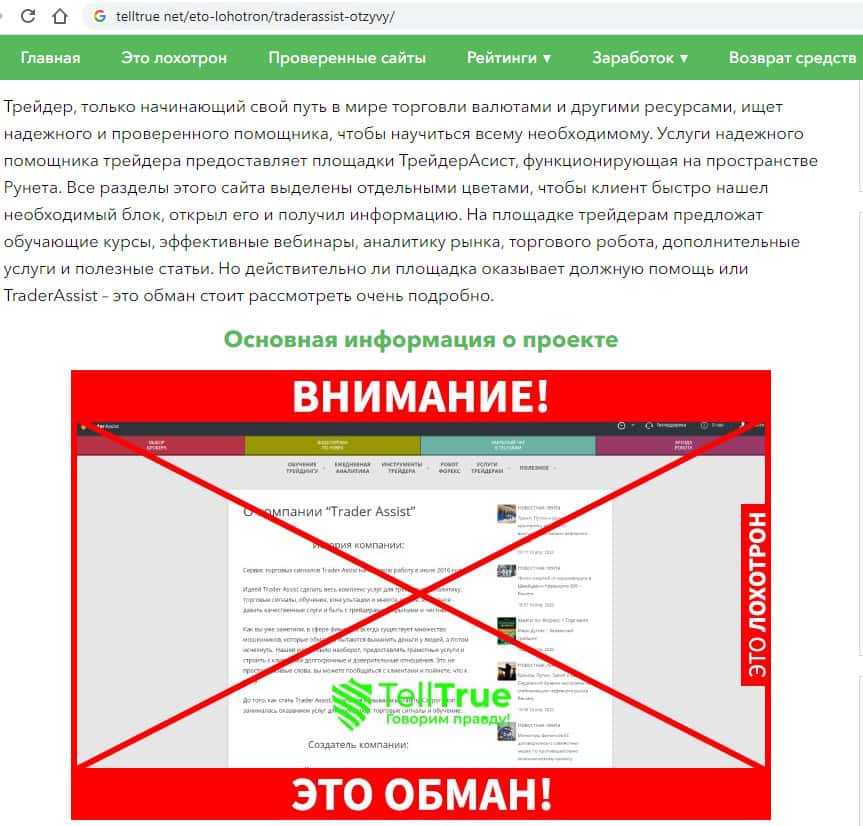 Второй ресурс, который прямо говорит о том, что трейдерам стоит держать подальше от таких жуликов, как Трейдер Ассист - это telltrue net.