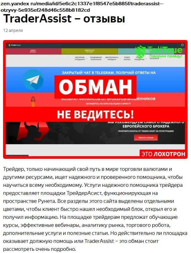 Еще один ресурс, который говорит о том, что traderassist ru - контора мошенников - это zen yandex ru. Тут тоже предостерегают от такого сотрудничества.
