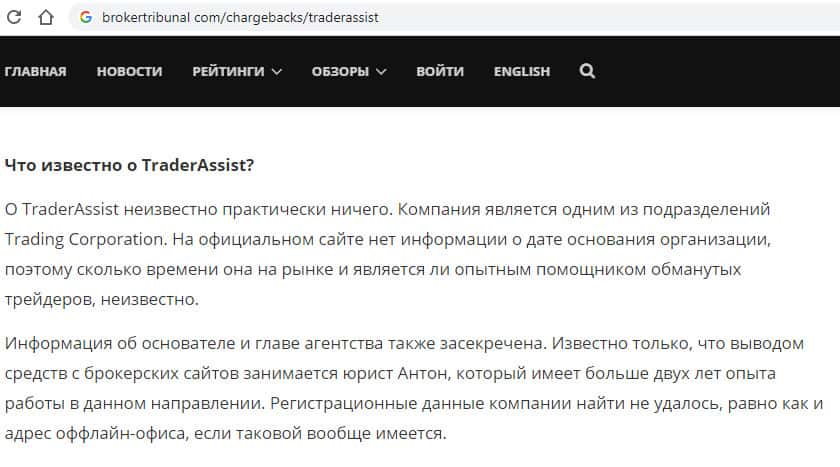 Первый авторитетный ресурс, который выражает свое недоверие к Трейдер Ассист и говорит прямо, что о жуликах нет никакой информации - это сайт brokertribunal com.