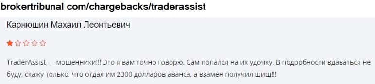 А в этот раз человек отдал жуликам TraderAssist 2300$ и его все равно кинули на деньги. Поэтому внимательно смотрите на то, с кем вы сотрудничаете.