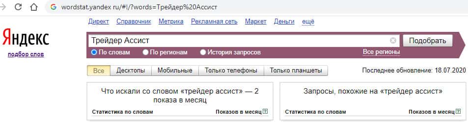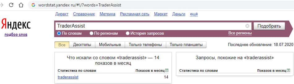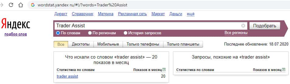 Второй запрос на английском, но с пробелом "Trader Assist" дает уже результат 20 раз в месяц. На 6 раз больше, чем в предыдущем.
