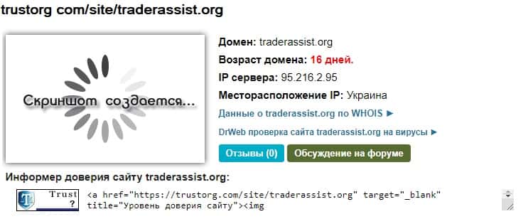 Анализ на сайте ТрастТорг Ком показывает, что домен мошенников Трейдер Ассист существует всего 16 дней! Сразу можно понять, что это за контора...