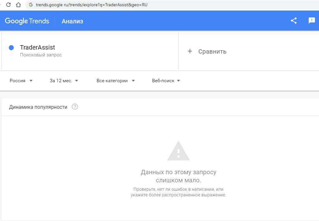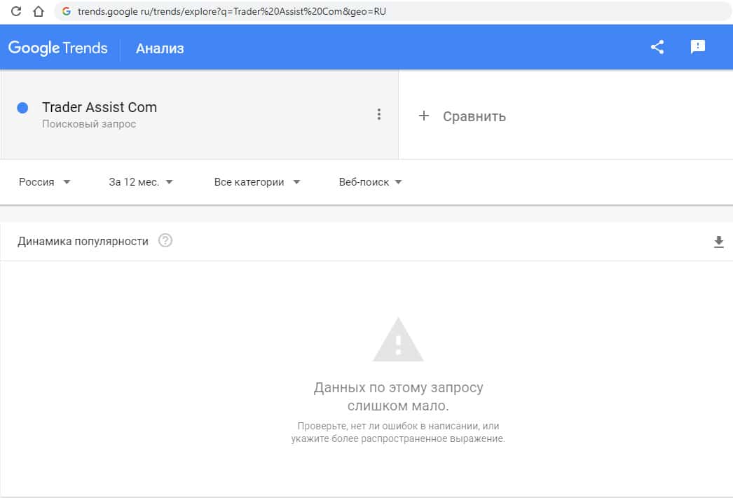 По запросу на английском языке "Trader Assist" с пробелом мы видим, что показов также нет. И так информацию о конторе никто не ищет.