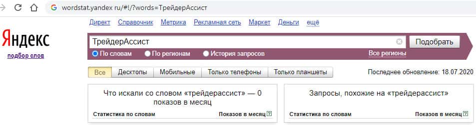 Теперь переходим к запросам на русском языке. И по первому же запросу "Трейдер Ассист" мы видим, что количество показов также равно нулю.