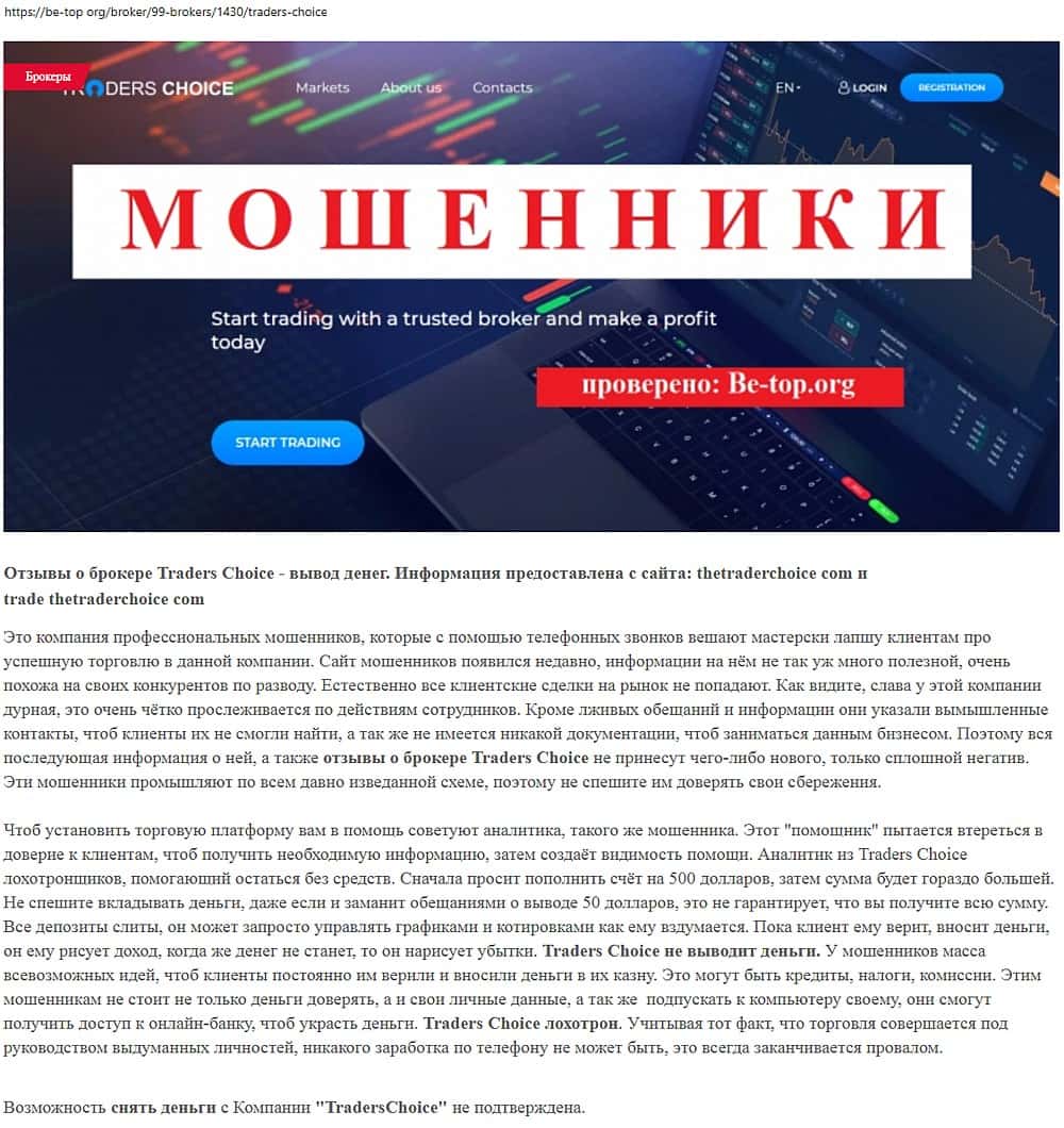 Шарлатанство Трейдер Чойс - молодой проект группы мошенников, но несмотря на это, каталы уже успели достаточно напакостить в сети, чтобы попасть в прицел веб-обозревателей.