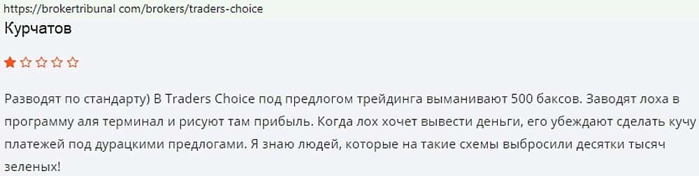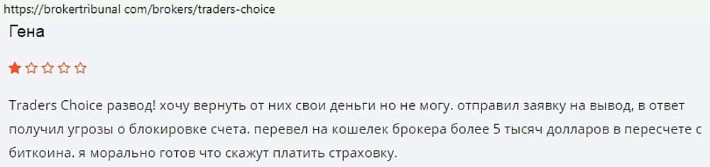 5000 долларов потерял человек, связавшись с каталами Трейдер Чойс. После заявки на вывод денег, представители липового брокера начали угрожать ему блокировкой его счета.