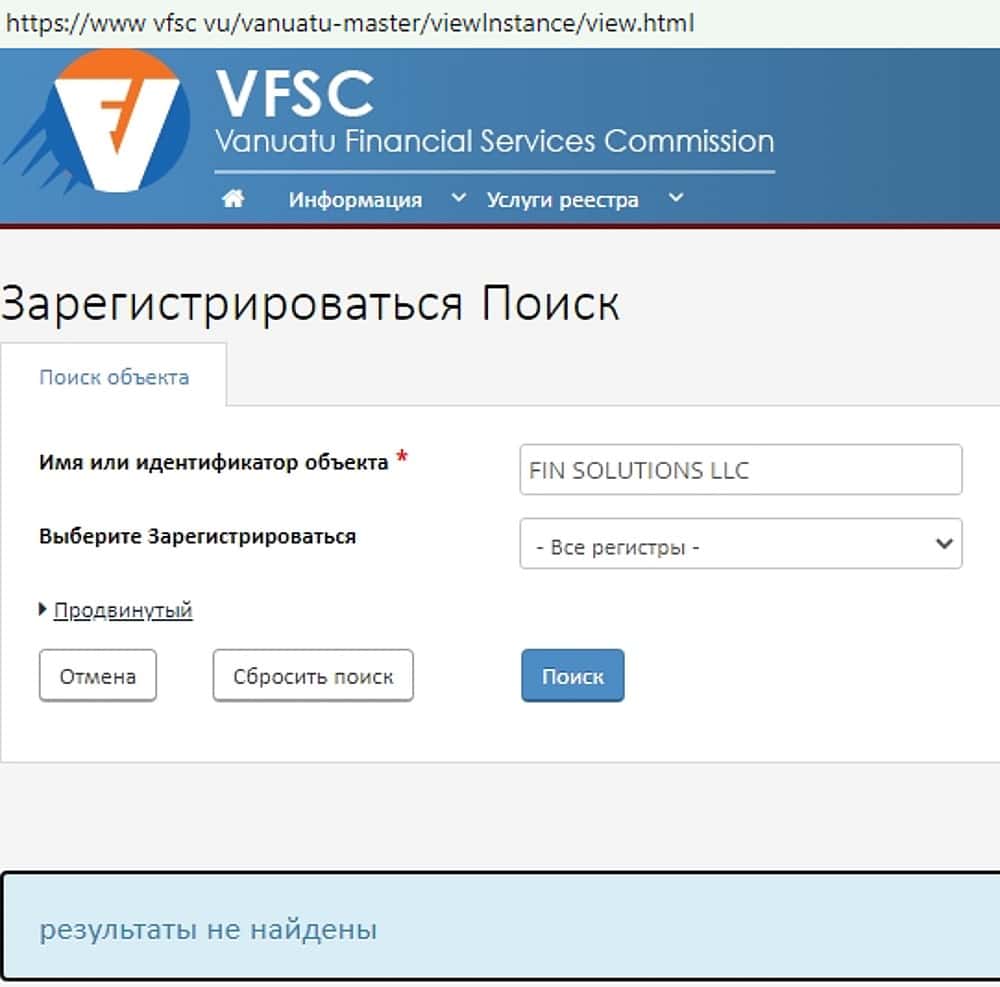 Но ранее, мы уже выяснили, что владелец лохопритона Трейдер Чойс, контора FIN SOLUTIONS LLC, якобы зарегистрирована в Вануату, однако регулятор VFSC о них не знает.