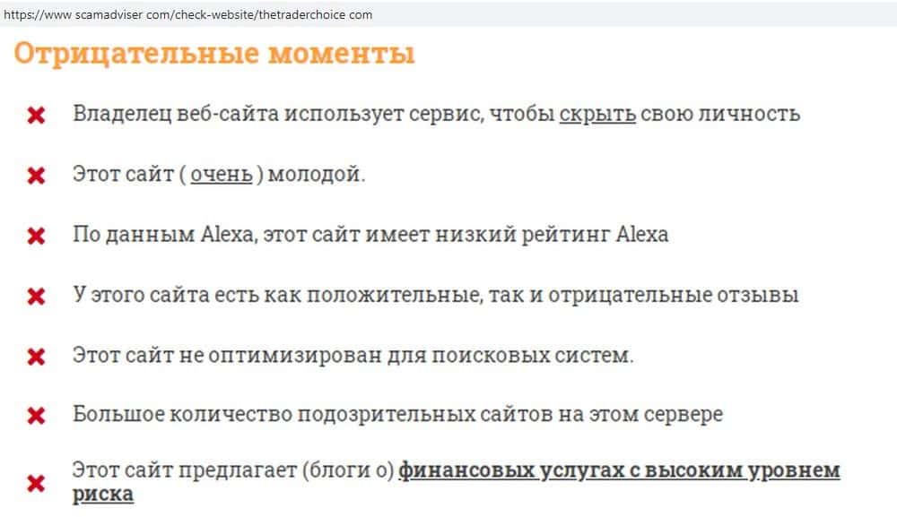 Онлайн-платформа скамэдвайзер ком предупреждает, что сайту спекулянтов Трейдер Чойс доверять нельзя: он появился недавно, но уже замечен в мошенничестве, владельцы прячутся.