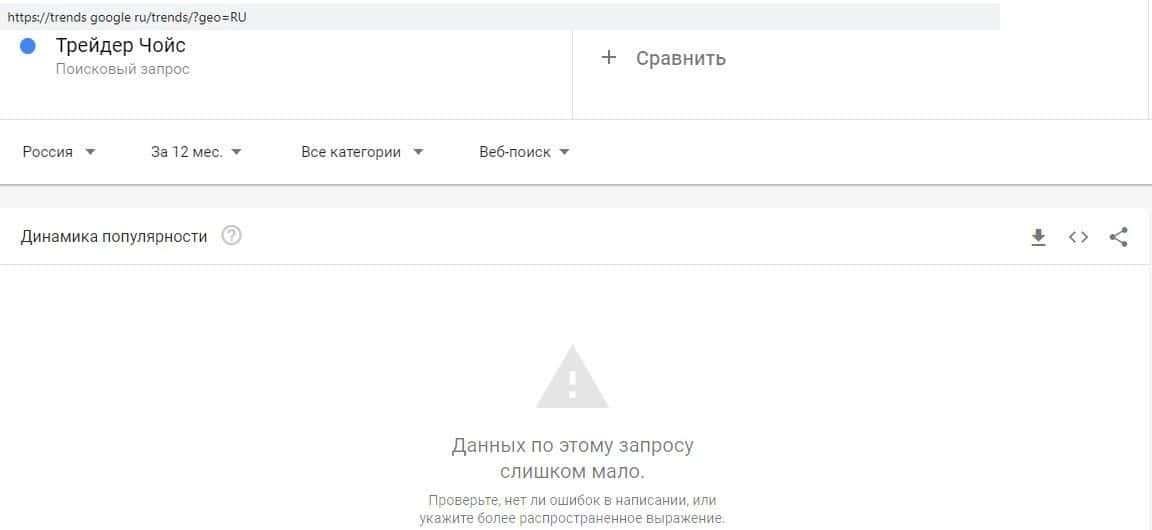 - Антипопулярность шарлатанов Трейдер Чойс среди фанатов поисковой системы Гугл