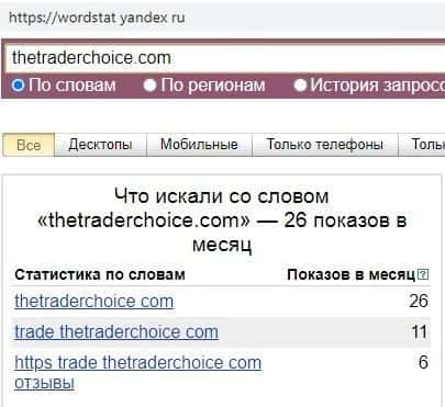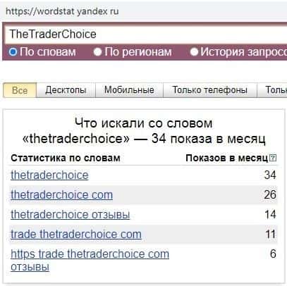 И латинское название мошеннической конторы "TheTraderChoice" осталось без внимания. Даже хитрое название, похожее на многие другие запросы, не помогла жуликам в продвижении.
