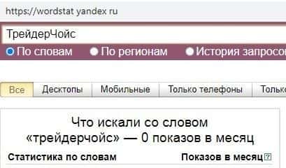 По запросу "ТрейдерЧойс" показов вообще не было. Афера появилась совсем недавно, и рассчитана на доверчивых новичков, которых с каждым годом остается все меньше и меньше.