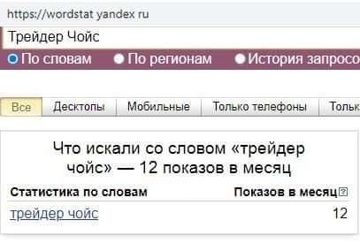 Лоховозка Трейдер Чойс не привлекает внимания людей по вполне понятным причинам. Тухлый проект создан только для развода. По запросу "Трейдер Чойс" всего 12 показов в месяц.