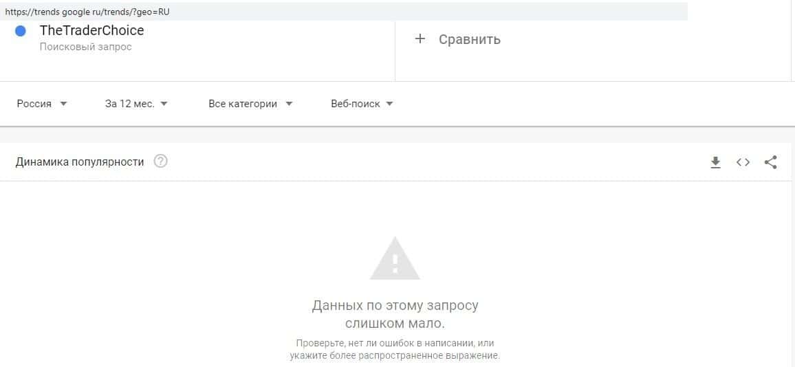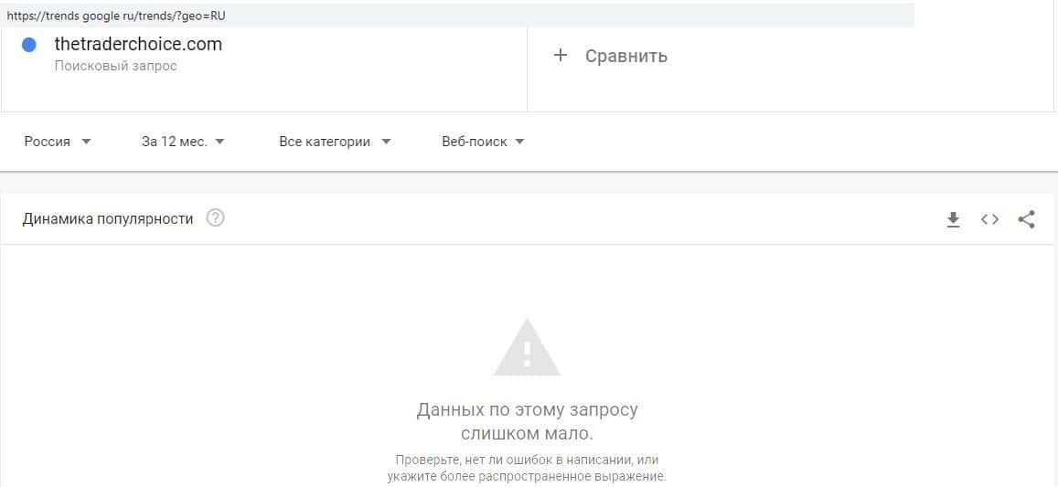 Сервис Гугл оценивает статистику за год. Не удивительно, что аферисты TheTraderChoice, которые работают без году неделю, непопулярны. По запросу "Трейдер Чойс" показов не было.