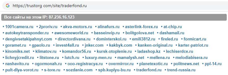 На информационном сайте trustorg com была произведена проверка ip-адреса мошеннической организации TraderFond Ru. Выяснилось, что сайт данной скам-организации находится по соседству с интернет-порталами, которые не имеют никакого отношения к рынку Форекс, а именно с новостными веб-порталами и интернет-магазинами.