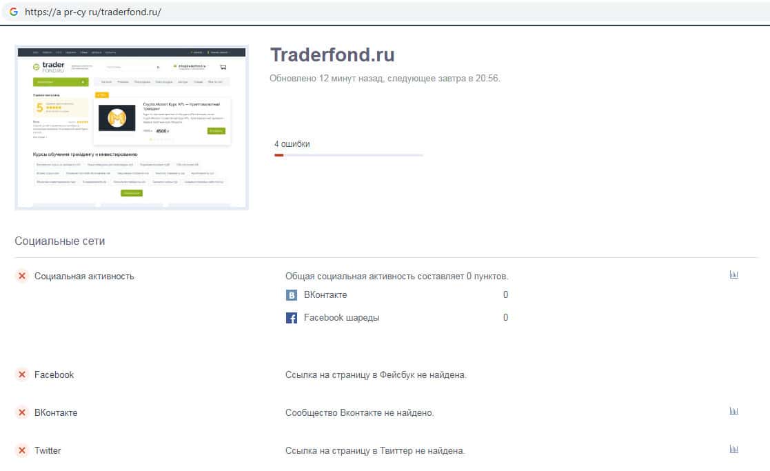 При проверке веб-сайта конторы Трейдер Фонд на интернет-портале a pr-cy ru была отыскана информация о том, что на официальном сайте шараги отсутствуют ссылки на их страницы в социальных сетях, что является первым признаком мошенничества, поскольку на самом деле страницы не были удалены.