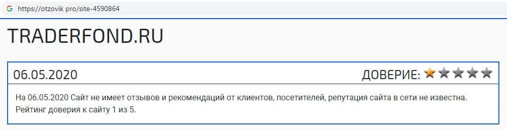 На онлайн-сервисе otzovik pro расположена статья о том, что сайт аферистов TraderFond Ru не имеет каких-либо рекомендаций от клиентов и посетителей. Репутация во всемирной паутине не известна. Исходя из этого можно сделать вывод о том, что доверять сомнительному скам-проекту Трейдер Фонд не имеет смысла !!!