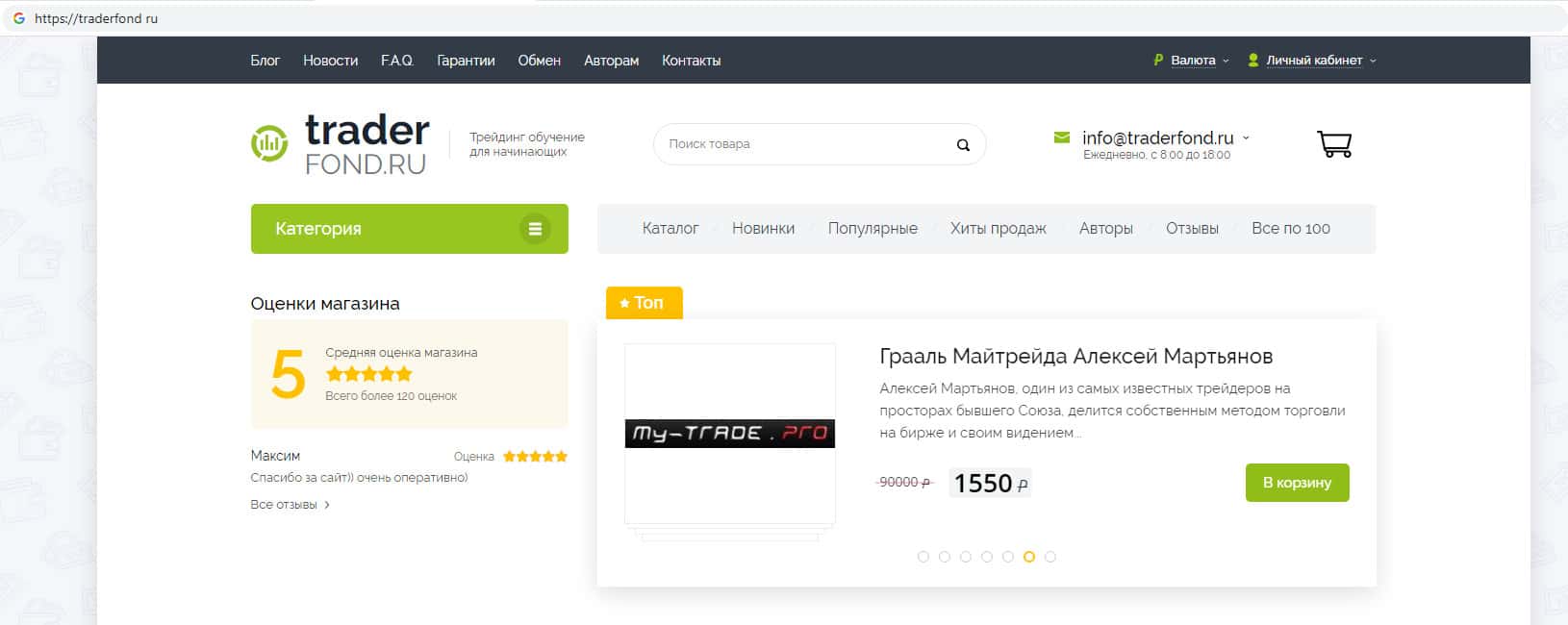 Жулики TraderFond Ru предлагают пользователям их фальшивого интернет-ресурса приобрести якобы бесплатные курсы по трейдингу, а так же купить видео-уроки о торговле на рынке Форекс для начинающих, и конечно же книги по психологии трейдинга. Не ведитесь на мошеннические уловки компании Трейдер Фонд, не покупайте предлагаемые ими материалы !!!