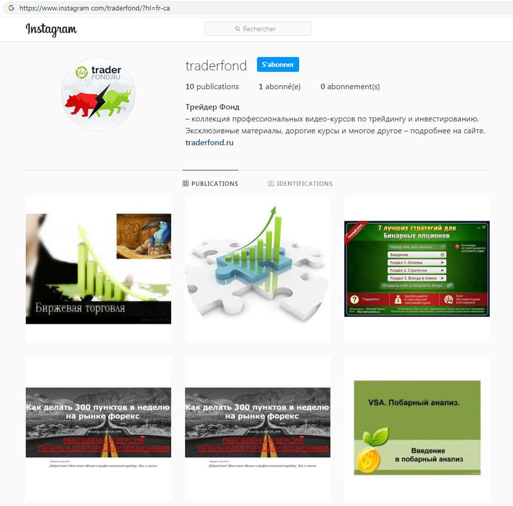 Шулера Трейдер Фонд так же зарегистрировались в социальной сети instagram com, где конечно же разместили активную ссылку на свой дырявый сайт. Здесь жулики пишут, что якобы предоставляют целую коллекцию видео-курсов по трейдингу и инвестированию. Не ведитесь на лживые обещания мошенников TraderFond Ru !!!