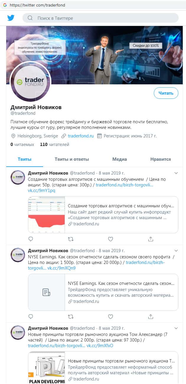 Главным представителем скам-компании Трейдер Фонд в социальной сети twitter com является некий Дмитрий Новиков, который предлагает платное обучение псевдо-науке, а именно трейдингу на рынке форекс и биржевой торговле, якобы почти бесплатно. Но как мы уже знаем, бесплатный сыр только в мышеловке. Поэтому не ведитесь на рекламу TraderFond Ru !!!