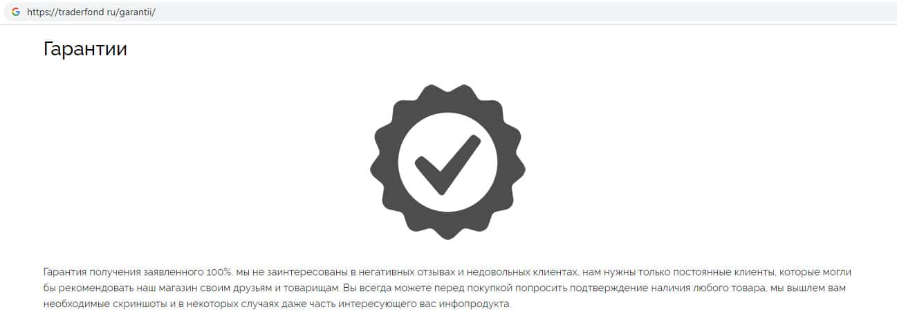 Если внимательно присмотреться к тому, что пишут аферисты Трейдер Фонд на своем официальном сайте, можно увидеть то, что данная контора гарантирует только лишь то, что пользователь получит заявленное. При этом нет никакой гарантии того, что эти знания каким-либо образом помогут получить обещанную скам-брокерами прибыль !!!