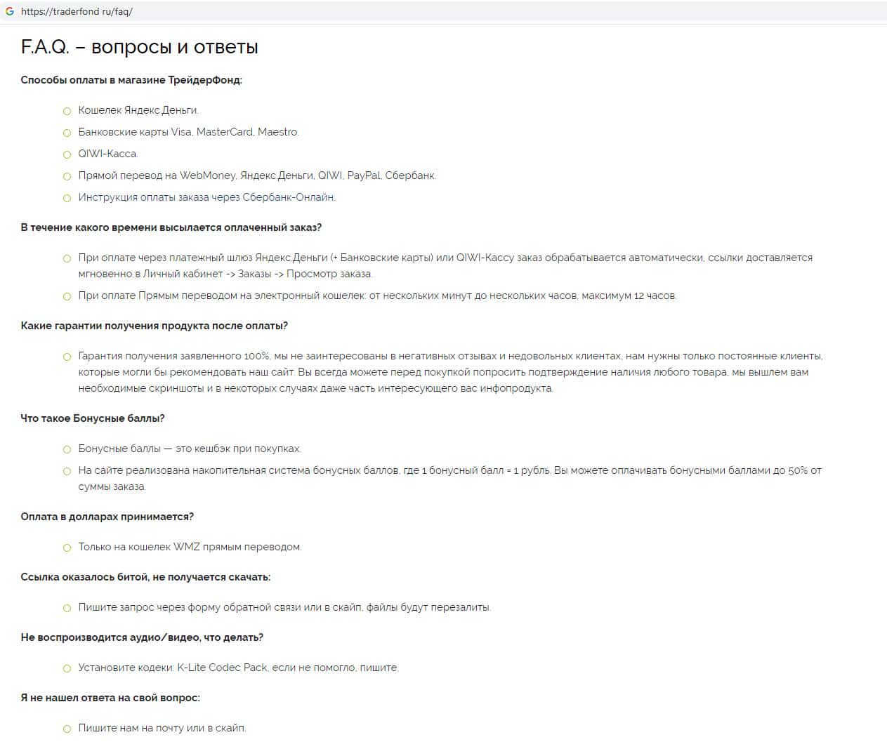 В случае возникновения каких-либо проблем связанных с выводом денежных средств, мошенники TraderFond Ru всегда будут ссылаться на предлагаемые ответы. Шулера Трейдер Фонд аргументируют это тем, что ответы на Ваши вопросы уже прописаны и у них нет такой возможности более подробно отвечать.