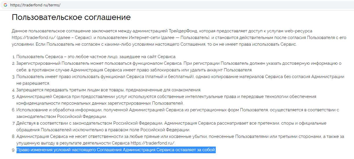 Аферисты TraderFond Ru пользовательское соглашение решили предоставить в сокращенном варианте, опубликовав только лишь 9 пунктов, среди которых самым важным является тот, где то, что скам-контора Трейдер Фонд вправе менять условия пользования сайтом без предварительно уведомления об этом пользователей своего интернет-сервиса.