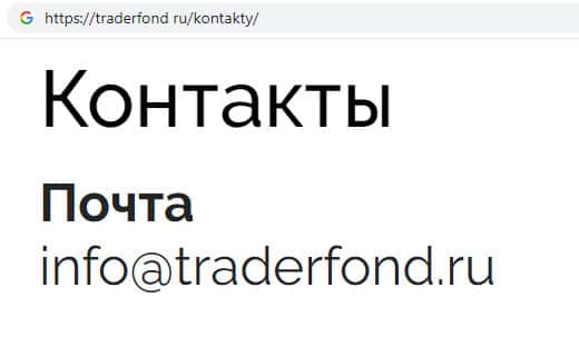 - адрес электронной почты скам-компании TraderFond Ru: info@traderfond ru