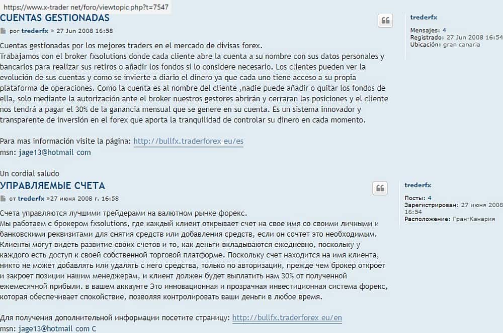 Жульническая конторка Трейдер Форекс хорошо подчистила за собой информацию о своих злодеяниях в сети. Хотя кое-что удалось найти. На одном из форумов для трейдеров x-trader net удалось найти человека, который активно предлагал услуги разводил Трейдер Форекс, делая упор и на их партнеров-аферистов FX Solutions. Контакты разводил Трейдер Форекс: