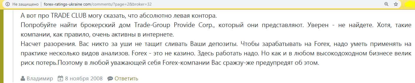 На скриншоте, расположенном ниже, можно увидеть отзыв недовольного пользователя , который утверждает, что Trader Club Broker - абсолютно левая контора. и для примера предлагает найти брокерский дом Trade-Group, который они представляют. Но, естественно, его никто не найдет, что еще раз подтверждает жульничество Трейдер Клуб Брокер.