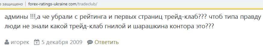 На изображении, расположенном ниже, вы можете увидеть еще один реальный негативный комментарий от облапошенного аферистами Trader Club Broker пользователя, который на своем опыте проверил работу кухни проходимцев Трейдер Клуб Брокер, по итогу чего клиент остался без денег, в связи с чем иметь дело с шулерами Trader Club Broker определенно не рекомендует никому.