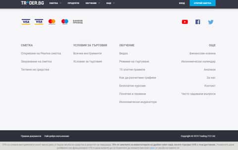 А завершается сайт у аферистов Трейдер Ком типичным меню на различные разделы сайта шулеров, ссылками на страницы жуликов Trader Com в социальных сетях, а так же предупреждением о рисках, в котором мошенники Трейдер Ком вполне уместно говорят о рисках торговли форекс и CFD.