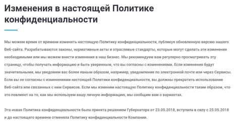 Завершается политика конфиденциальности у жуликов Трейдер Ком тем, что мошенники Trader Com оставляют за собой право в любой момент изменить данную политику конфиденциальности по своему усмотрению. На изображении ниже вы можете увидеть окончание политики конфиденциальности.