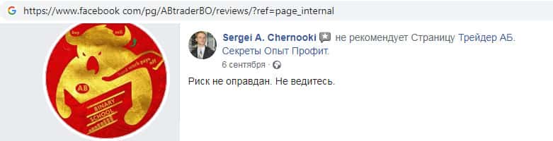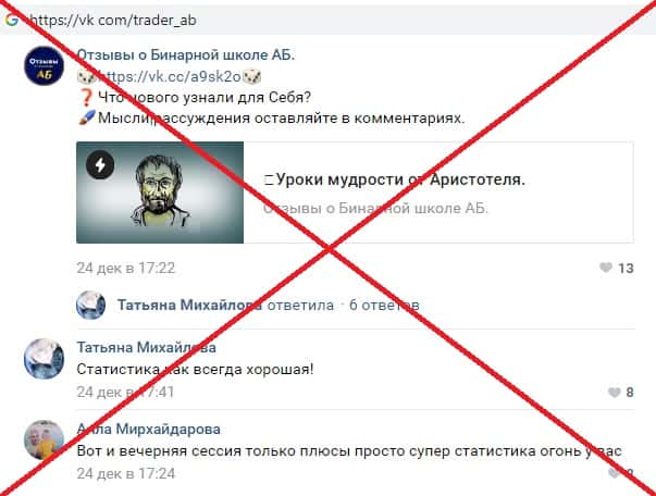 В глобальной сети интернет в социальной сети vk com были замечены отзывы о Бинарной школе АБ Трейдер, а именно фальшивые не правдивые комментарии. Не верьте той информации, которую пишут о различных мошеннических компаниях в социальных сетях, потому что подобного рода информация зачастую проплаченная самой конторой !!!