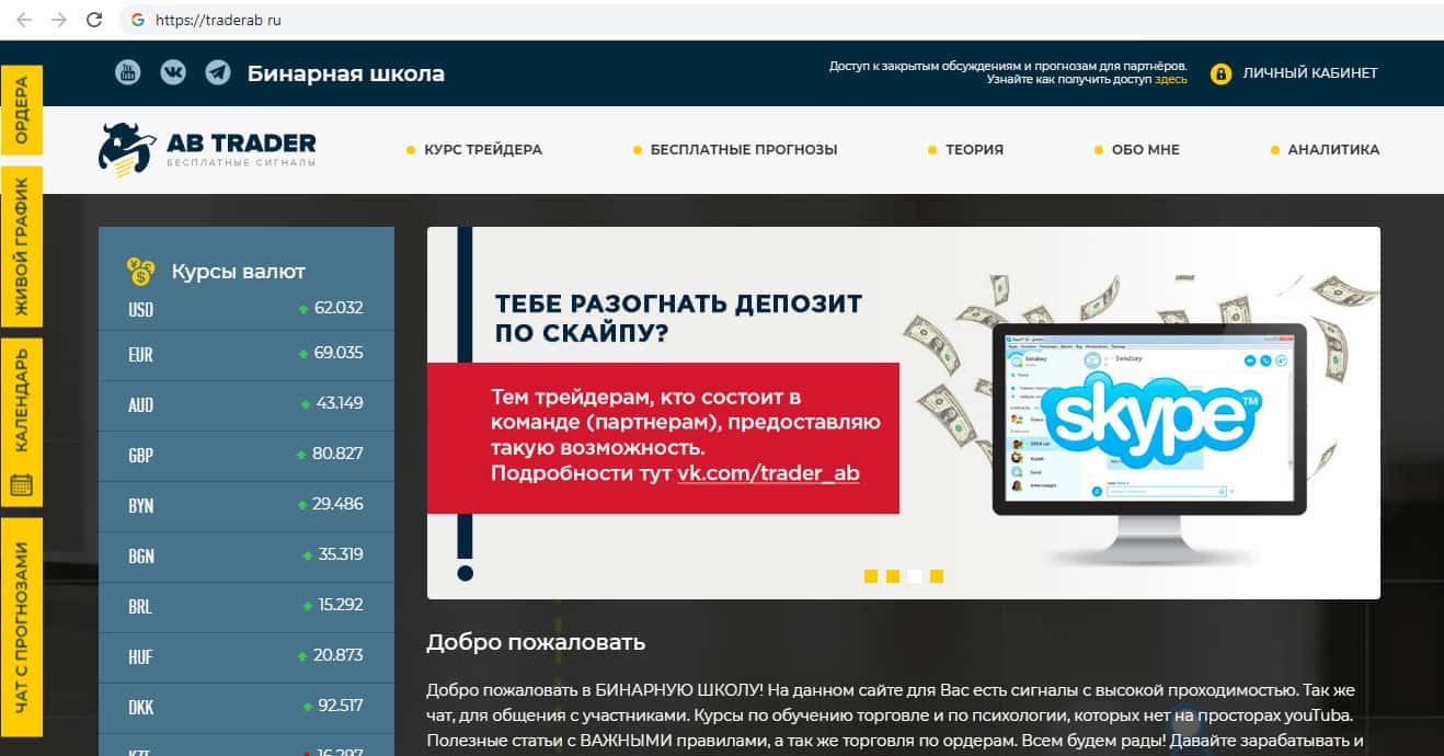 Сайт жуликов Traderab примитивный. Основная информация на данном сайте - реклама данной конторы в виде видео и ссылок на социальные сети. Обучиться в скам-организации АБ Трейдер ничему невозможно, потому что никаких знаний Вы не получите, а лишь только потеряете свое время и деньги.
