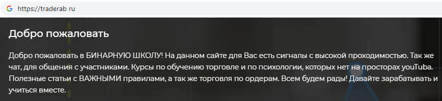 Скам-контора Traderab для привлечения как можно большего количества людей решила создать страницу в социальной сети vk com, где мошенники позиционируют свою организацию как Бинарную школу. К сожалению жулики АБ Трейдер не предоставили никакой дополнительной информации о своей компании.