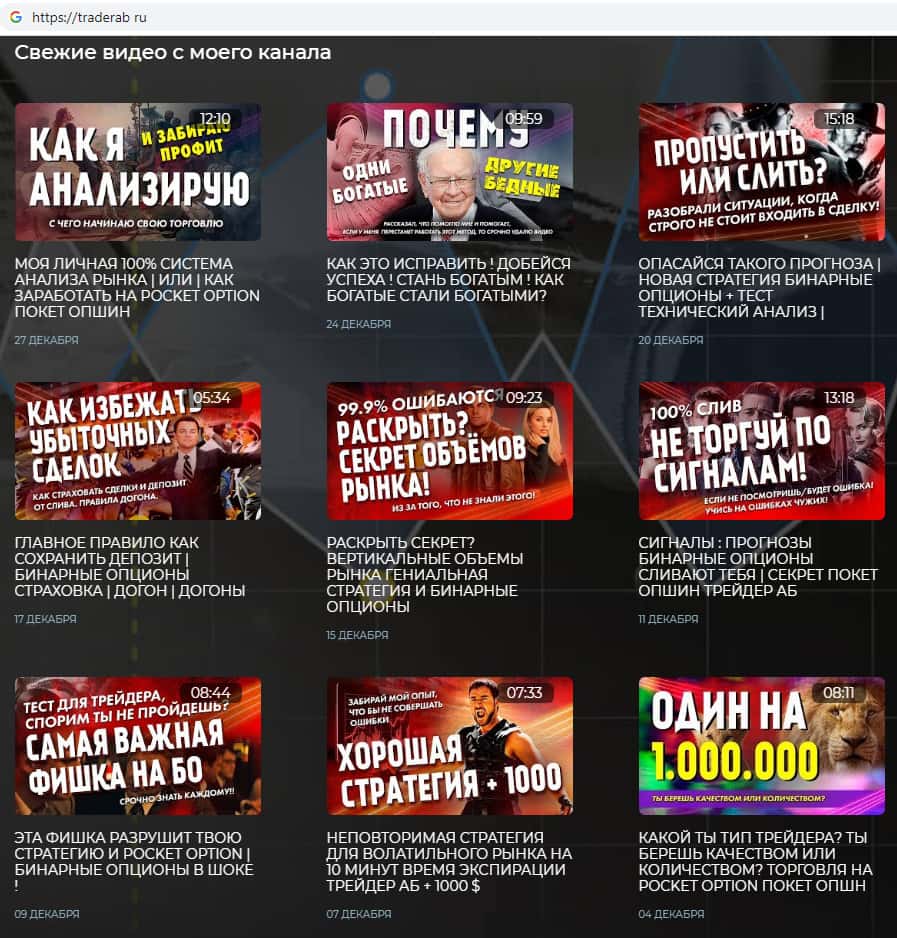 Мошенники Traderab предлагают посмотреть данные видео утверждая, что они являются информативными для тех, кто хочет чему-то научиться. После того, как у аферистов АБ Трейдер получится заманить Вас в свою контору, они в качестве практики начнут рекомендовать Вам торговать на сайтах на якобы хорошо известных им брокеров.