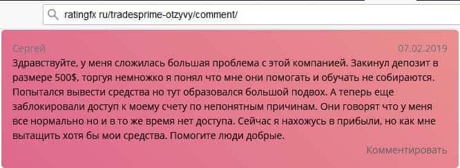 Человек закинул на депозит 500$, но как только вычислил вранье байки Трейдес Прайм о том, что они будут его обучать, захотел вывести свои деньги назад. Но, естественно, назад он ничего не получил уже. Жулики просто заблокировали ему доступ в личный кабинет по непонятным причинам.