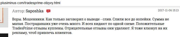 Как только очередной трейдер заговорил о выводе денег, Трейдес Прайм тут же их слили. Проще говоря: украли. Потому что вряд ли там велась реальная торговля с выводом денег на рынок. Скорее всего, деньги просто крутились внутри компании, как бывает с обычными кухнями и никто их не выводил на рынок.