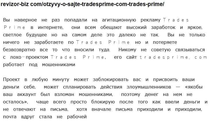 Развод на деньги Trades Prime можно было заметить даже невооруженным глазом. Потому что все признаки настолько явные, что просто нельзя было пройти мимо и все. Однако, как ни странно, но много людей купились на такой дешевый и тупой развод. И в результате лишились своих денег. Есть те, кто лишился последних.