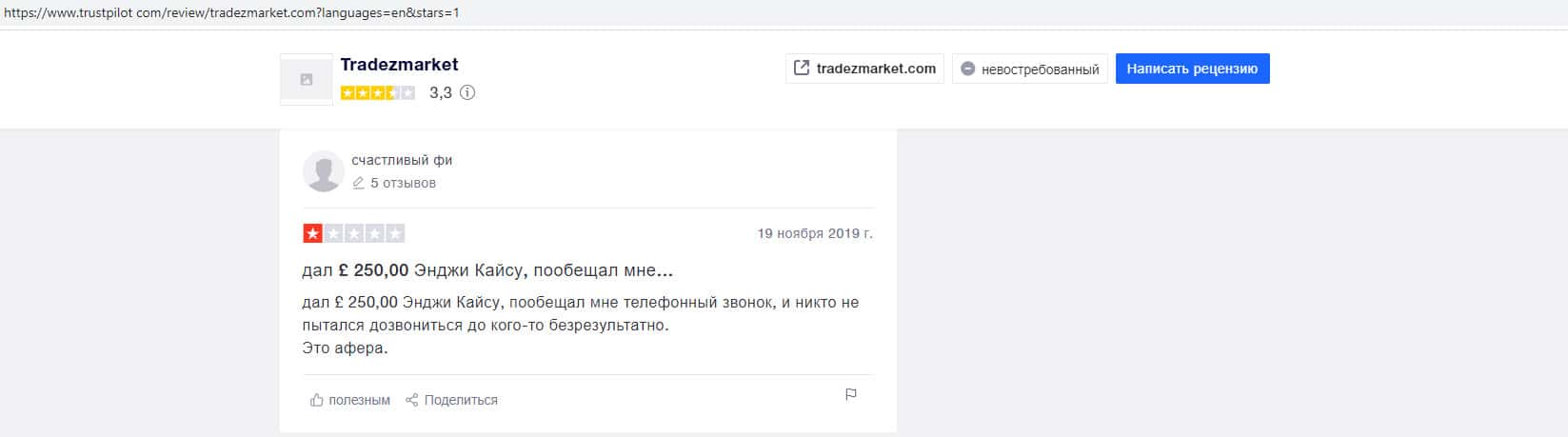 Автор этого негативного отзыва на сайте-отзовике trustpilot com дал 250 фунтов стерлингов Энджи Кайсу, менеджеру, который представлял контору Трейдез Маркет, после он пообещал ему сделать телефонный звонок, но телефонного звонка не было, даже извинений по этому поводу, просто они слились. Они просто решили выкачать деньги из наивного пользователя интернета.