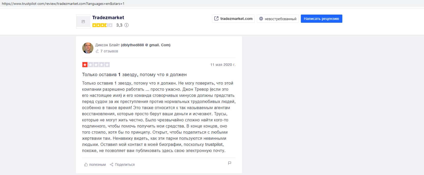 На портале trustpilot com пользователь Диксон Блайт обвинял контору Трейдез Маркет в мошеннических действиях по отношению к своим наивным и глупым клиентам. Он сам стал жертвой мошеннических действий Трейдез Маркет. Он написал этот отзыв для того, чтобы на его месте уже никто не оказался, но Трейдез Маркет тоже очень хорошо пиарят себя.