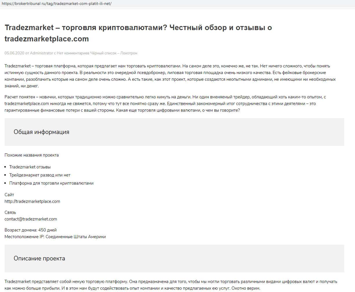 В интернете на портале bezobmana24 com находится статья, которая рассказывает, что Трейдез Маркет не более чем лохотроновский проект, который всеми силами пытается надурить людей на деньги, причём делают это очень нагло и глупо. Также подводят к тому, что подобные проекты в интернете уже давно стали обыденным делом.