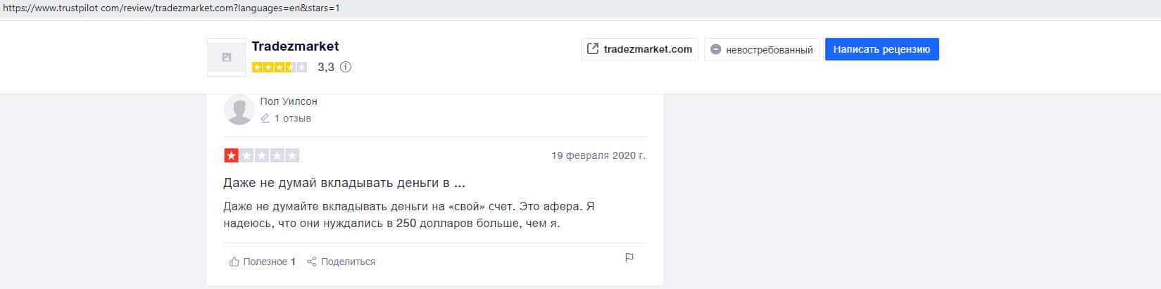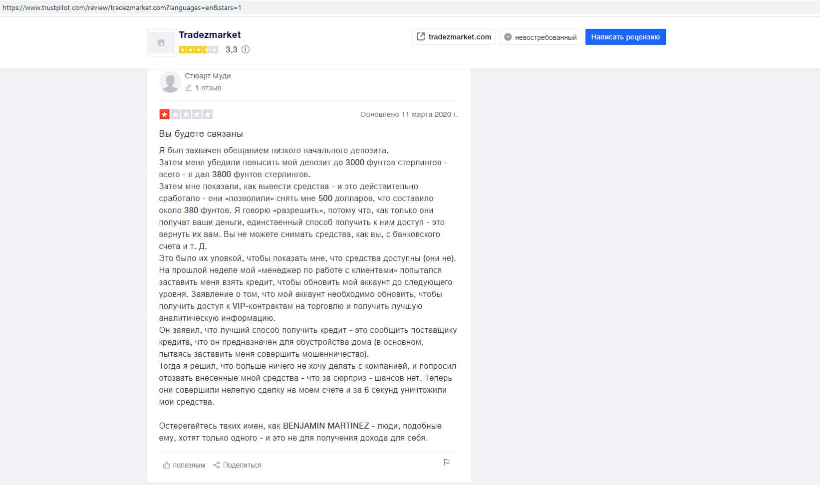 Обманутый пользователь мошеннического онлайн-проекта Трейдез Маркет сообщает в своём отзыве на веб-ресурсе trustpilot com о том, что эта кухня, как многие в наше время - мошенническая, при этом они сначала просят внести маленькую сумму, а затем с помощью уловок делают так, чтобы клиент отдал им очень большие деньги.
