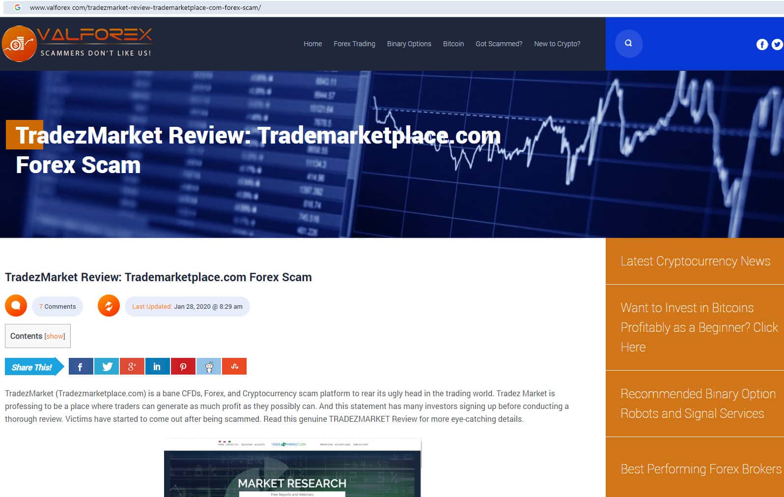 На сайте valforex com расположена рецензия на мошенническую кухню TradezMarket. В ней автор статьи раскрывает всё гнилое нутро очередного лохотронщика на международном рынке - Трейдез Маркета. Автор пытается нас уберечь от мошенников TradezMarket, который сделает всё ради того, чтобы приумножить свою прибыль хотя бы в несколько раз.