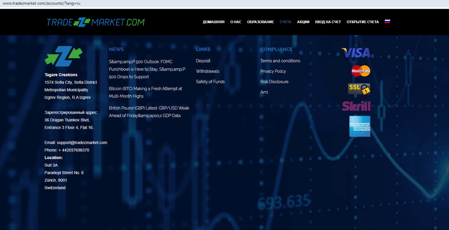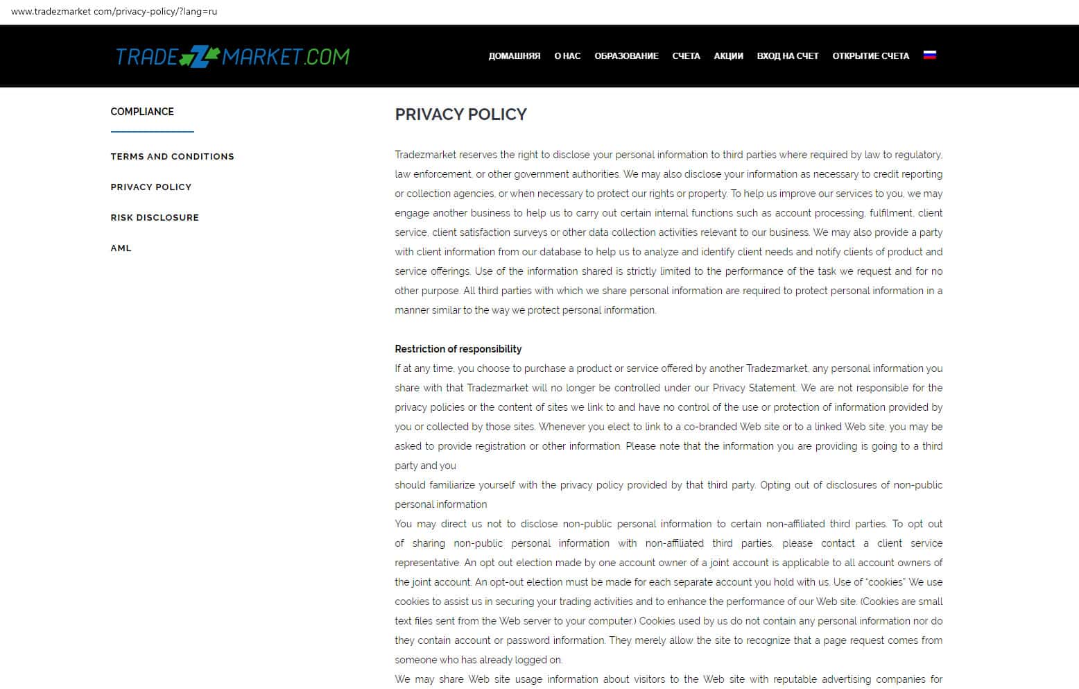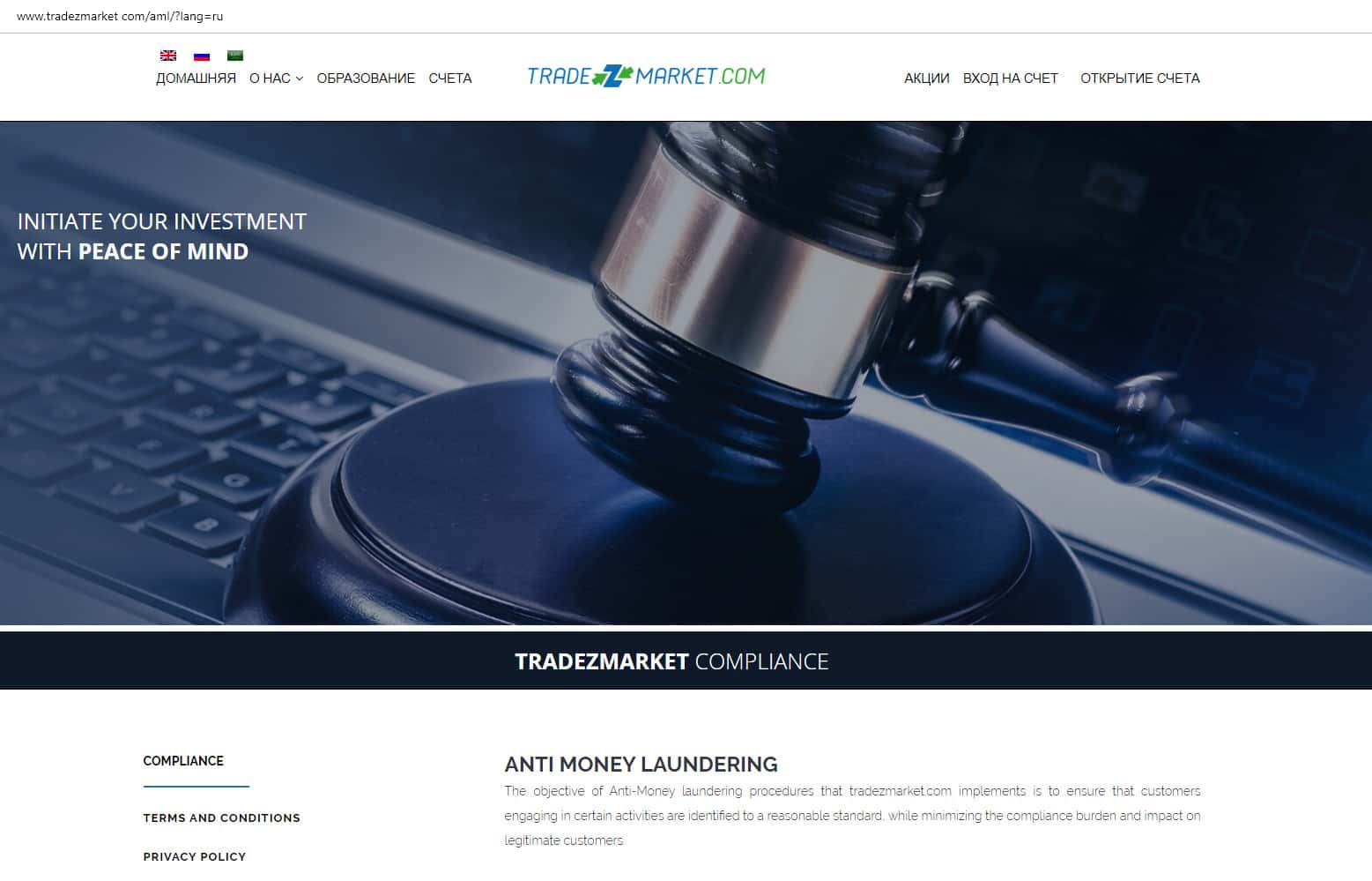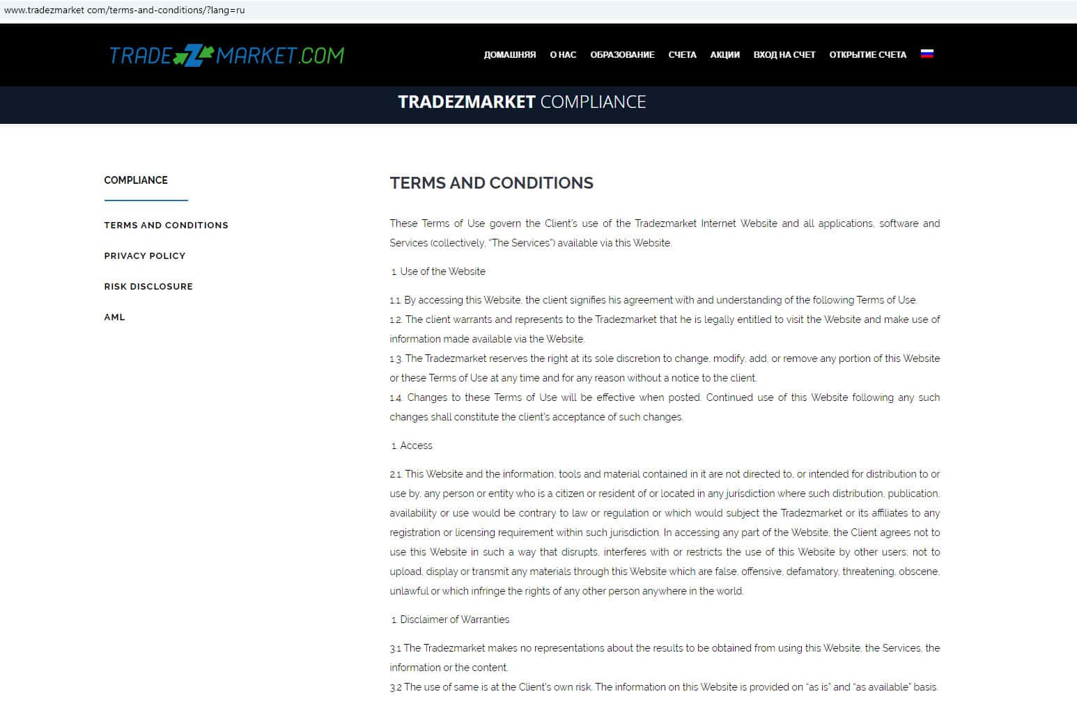 На сайте tradezmarket com можно прочитать условия и соглашение, с которыми должен согласиться пользователь перед тем, как стать клиентом. Как только начинаешь читать условие, то сразу как-то хочется уйти, так как это по сути записываться в рабство, в котором из вас вытянут все соки и деньги, которые только у вас есть.