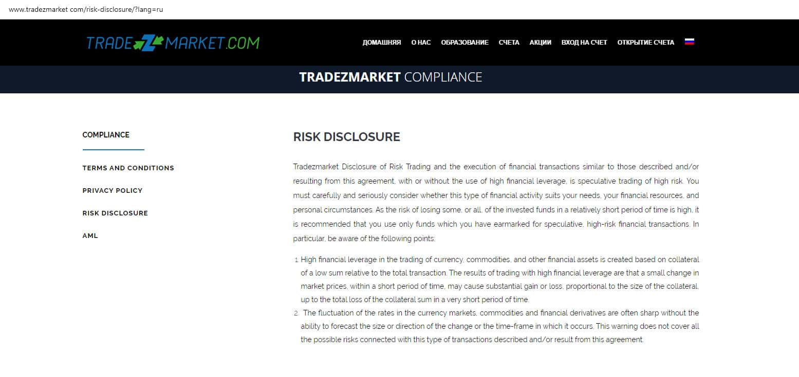 Если поискать на сайте, то можно найти предупреждение о рисках, которые оказывается сопровождают клиента всё время. Почему Трейдез Маркет не сказал сразу о них? Мне кажется, что малое количество пользователей найдёт это предупреждение. Многим просто не придёт в голову искать какие-то тайные страницы.
